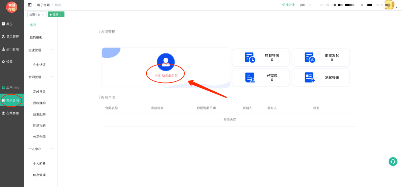 登录后创建企业,进入对应的企业--管理--电子合同应用,首先要先完成实名认证。